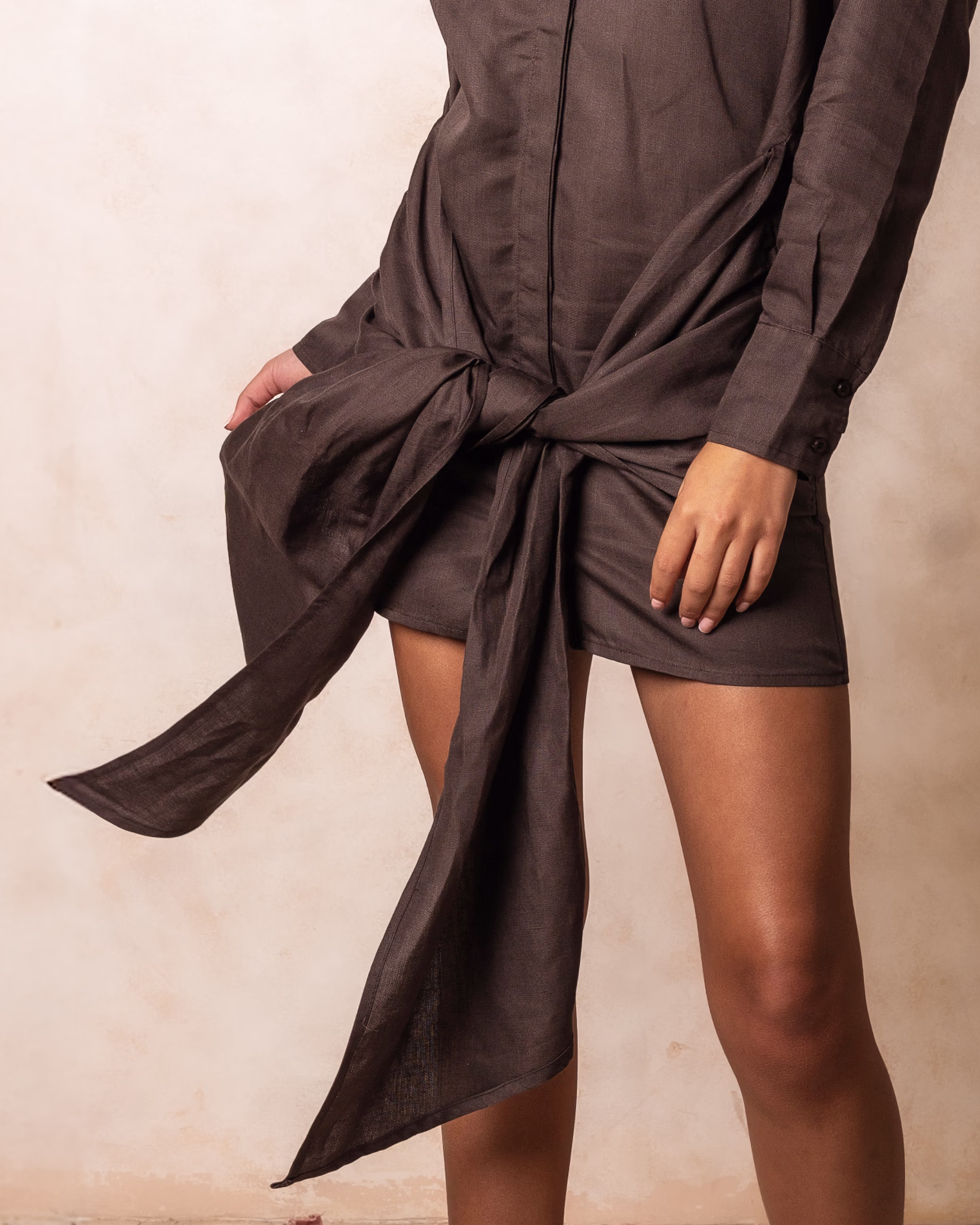 The Brown Linen Shirt Dress is crafted from breathable linen with a tailored silhouette and soft structure. Designed with a classic collar and button-through front, it features an elegant wrap detail that defines the waist for a timeless, effortless finish. A versatile piece that transitions seamlessly from day to evening.